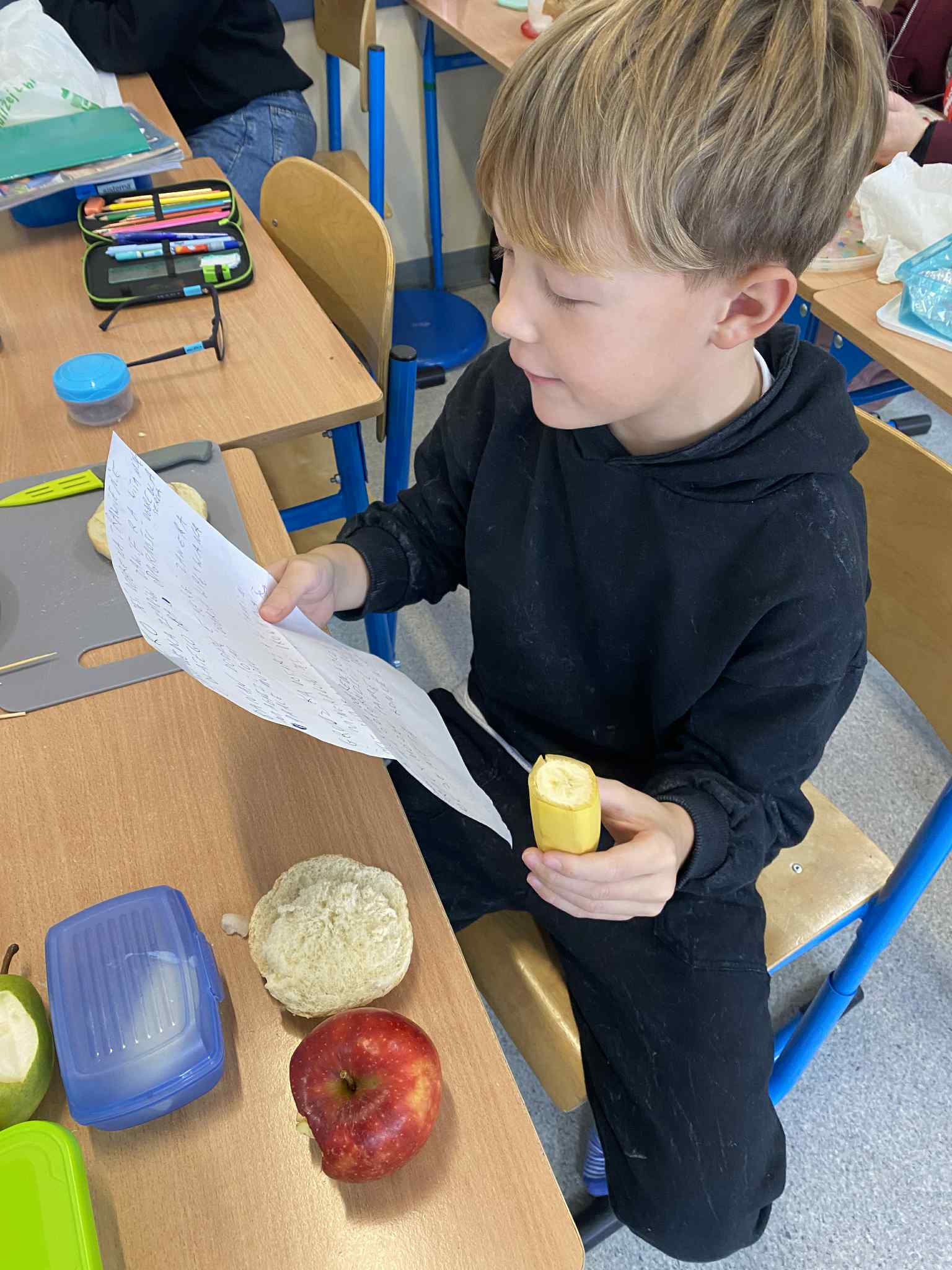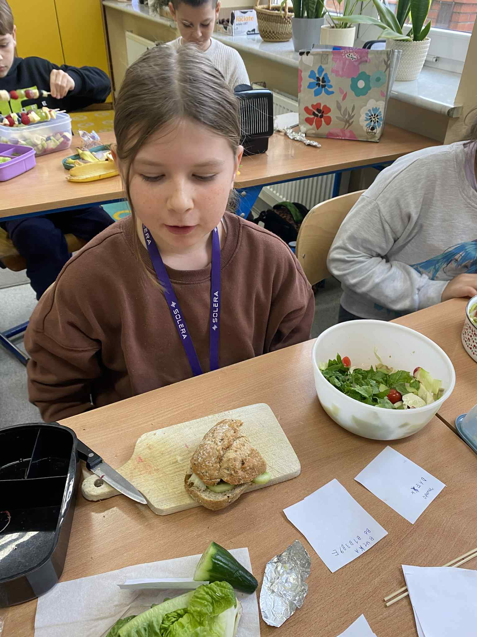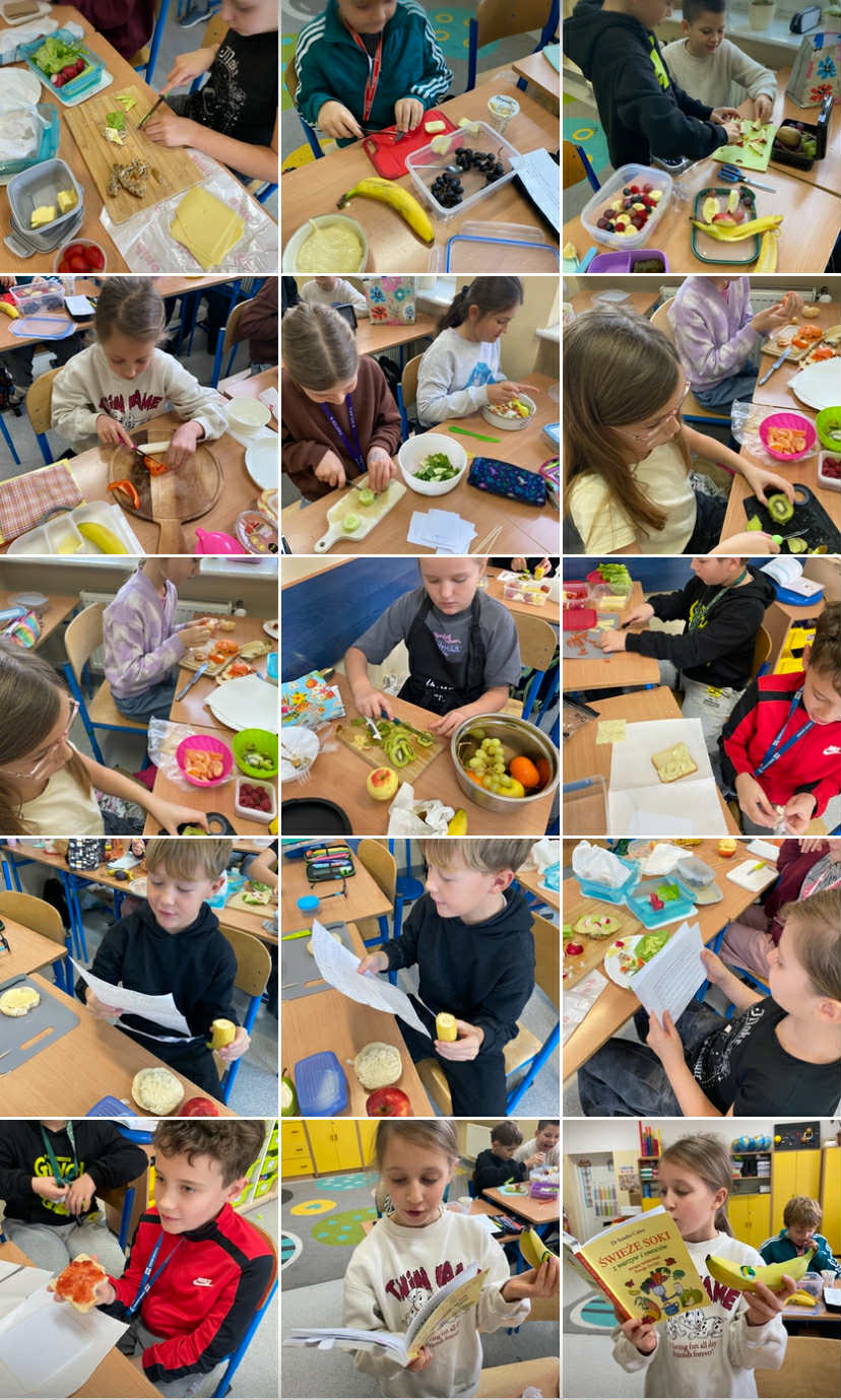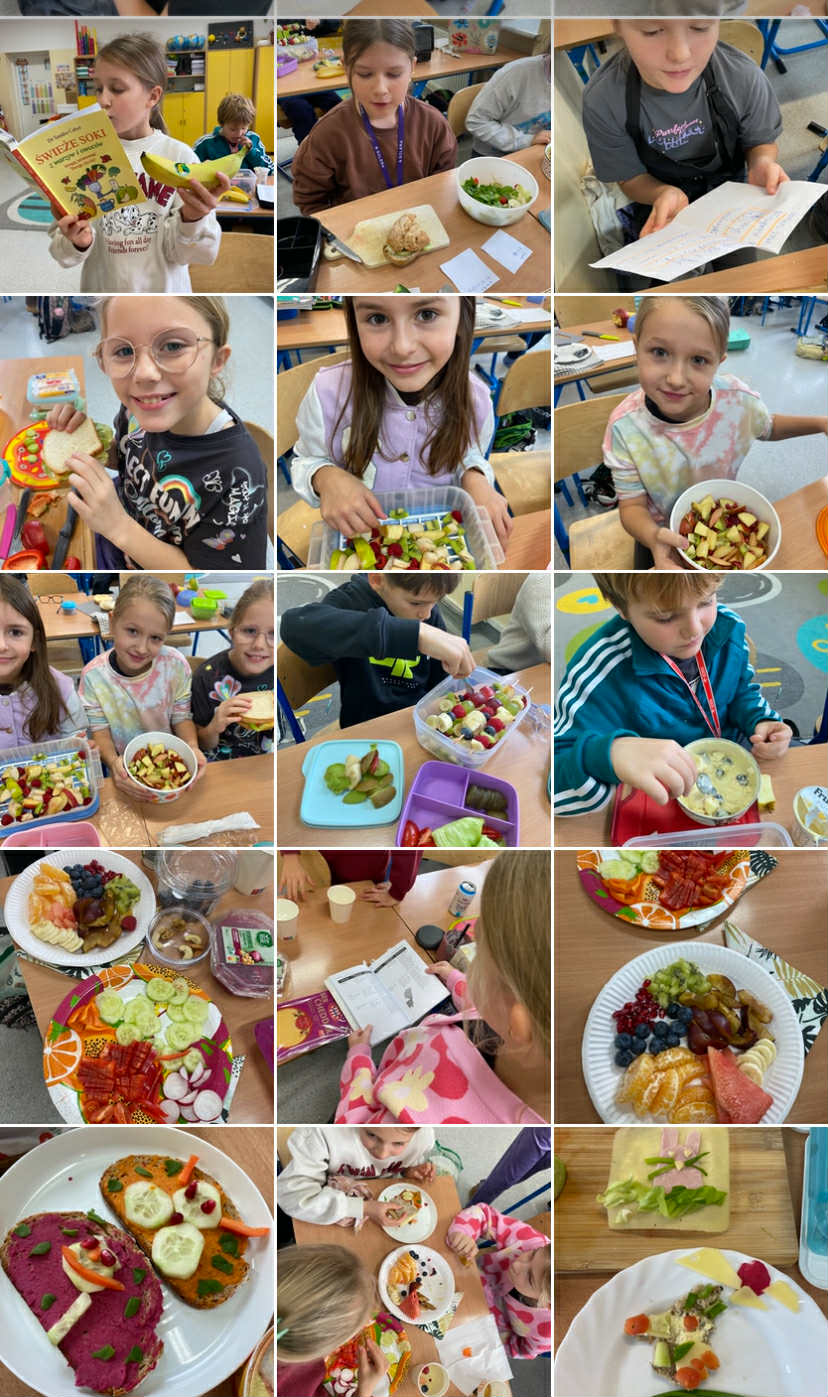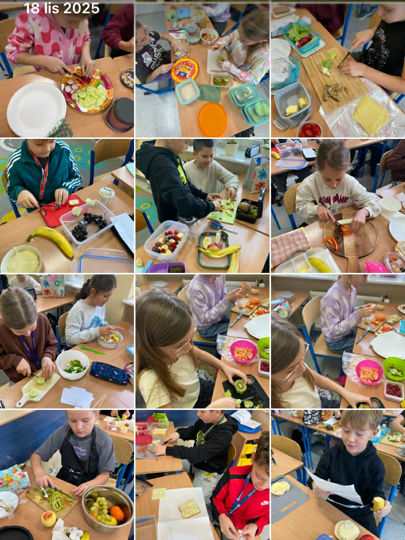 Podczas dzisiejszej lekcji przyrody uczniowie wzięli udział w zajęciach praktycznych dotyczących zdrowego odżywiania. Każdy z nich przyniósł wybrane przez siebie produkty spożywcze, z których następnie samodzielnie przygotował zdrowe śniadanie. Wśród składników znalazły się m.in. pełnoziarniste pieczywo, świeże warzywa, owoce, nabiał oraz różne źródła białka.