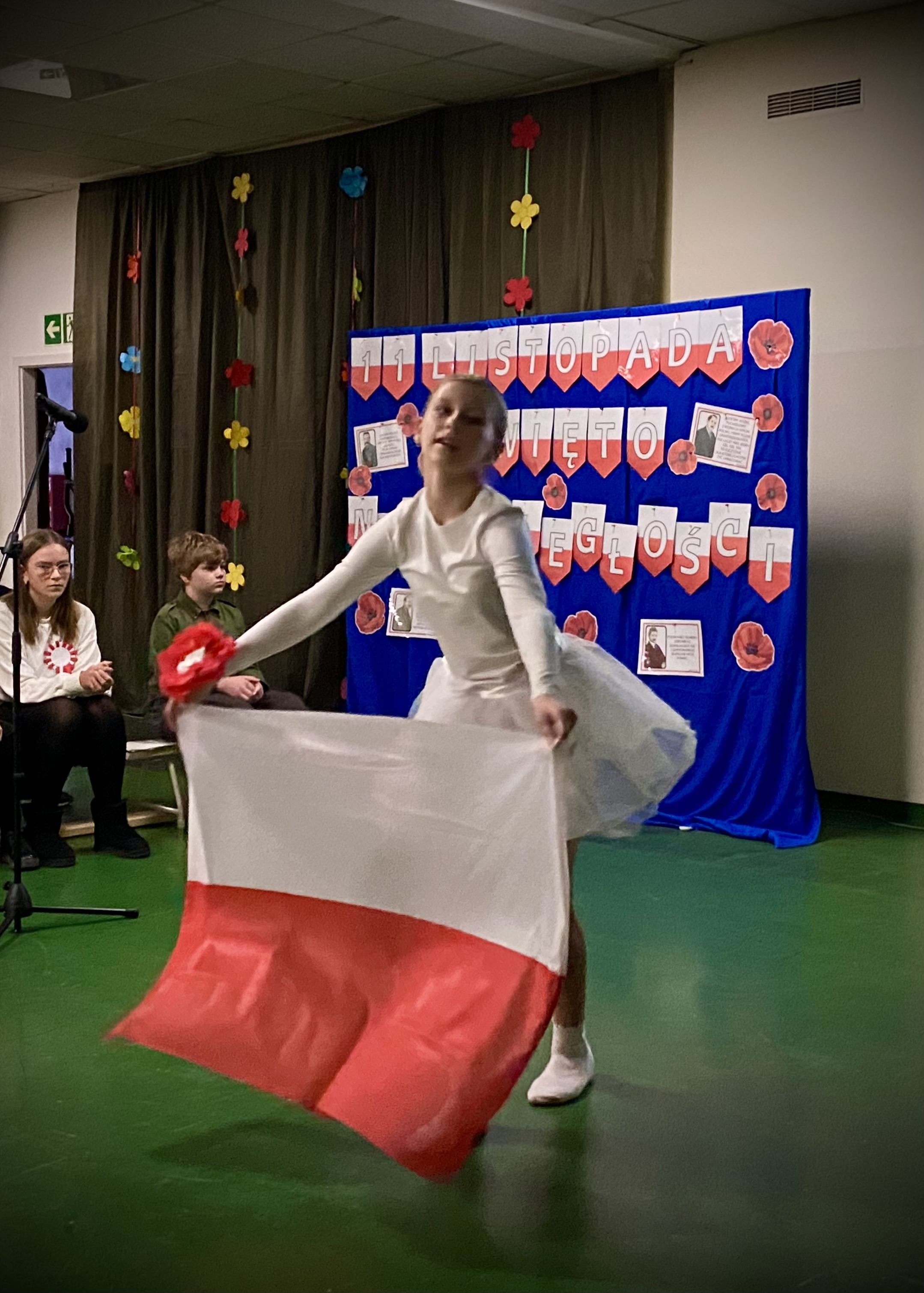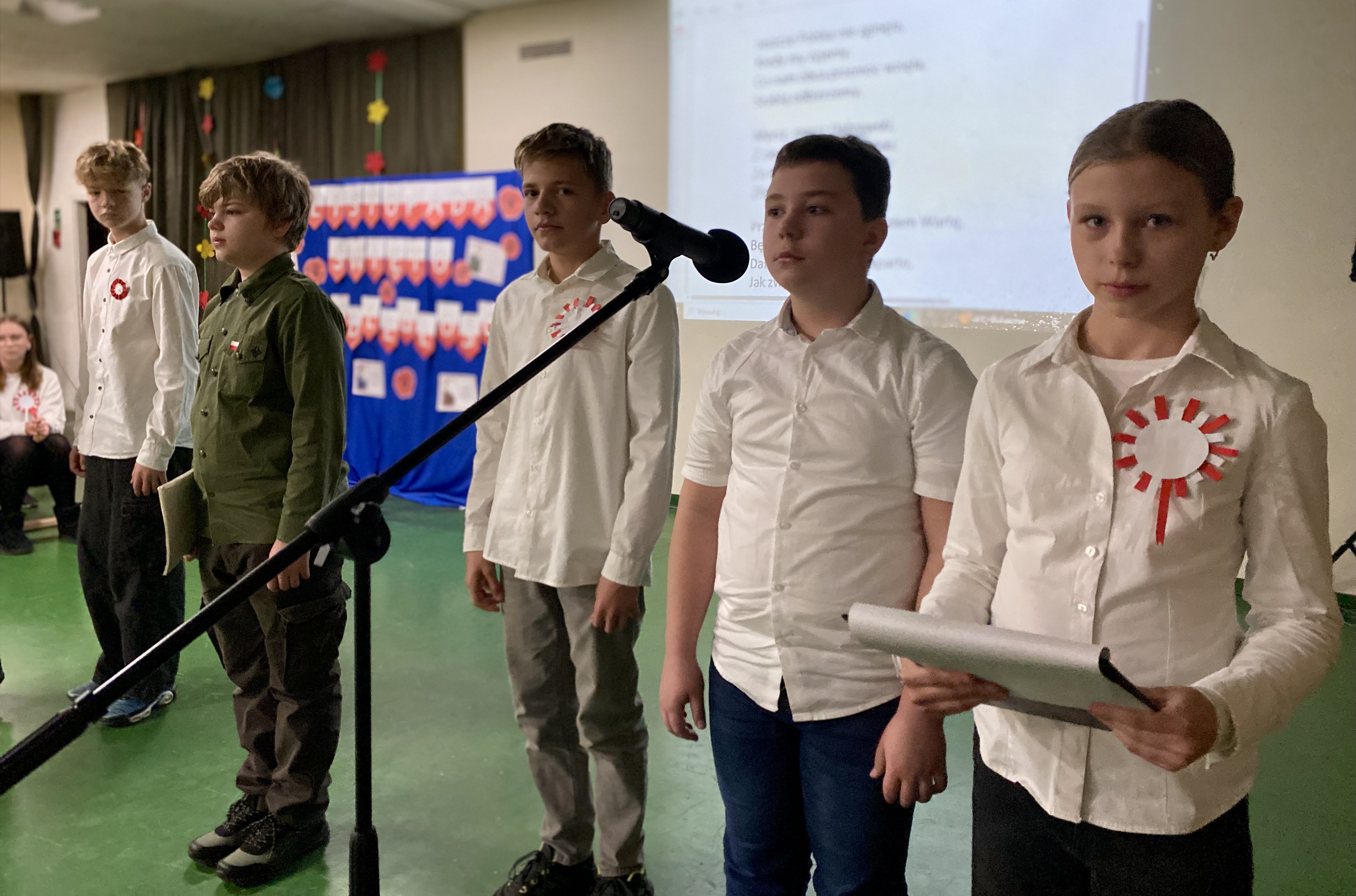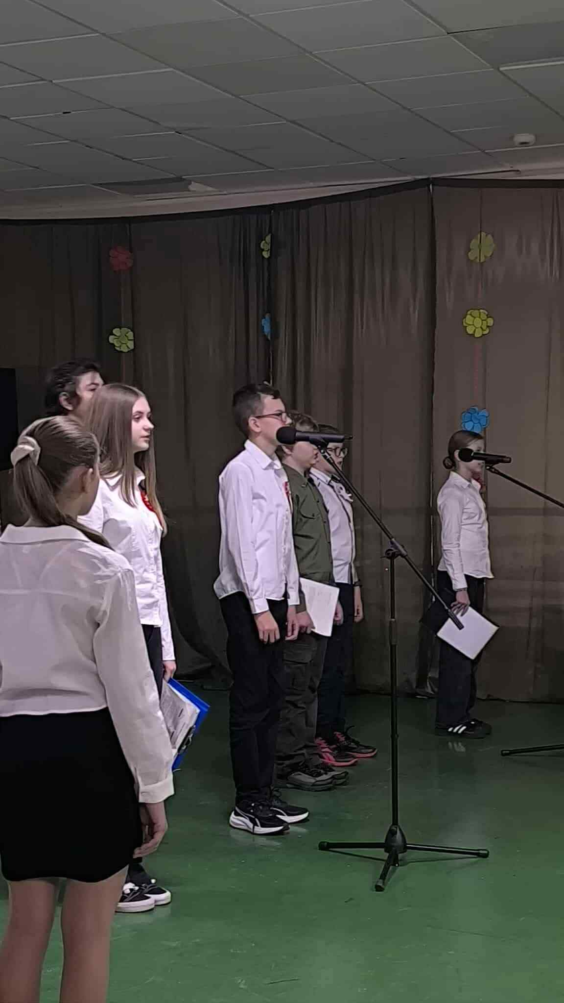 Soliści: Helena Bzik i Antonina Szulc, obok nich uczniowie z klasy 6a. Baczne oczy Wielkich Braci: Lidii Pietrzak oraz Dariusza Krysika, ręce czuwające na klawiaturach: Klaudia Marchewka i Łukasz Kalina. 107 lat od odzyskania przez Polskę niepodległości.