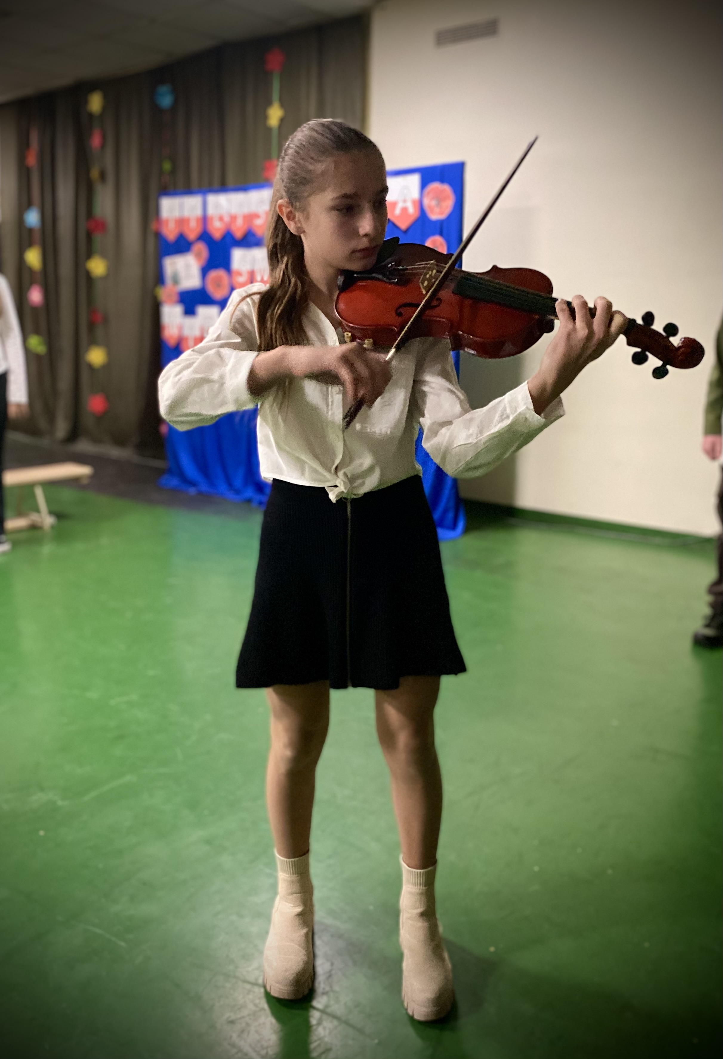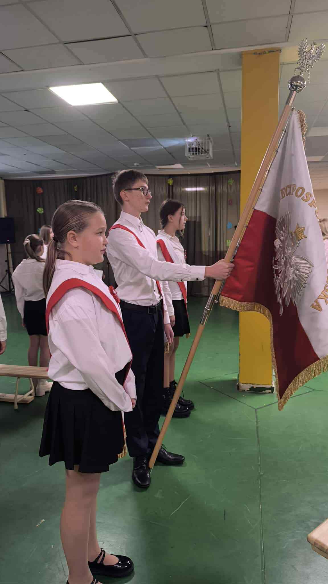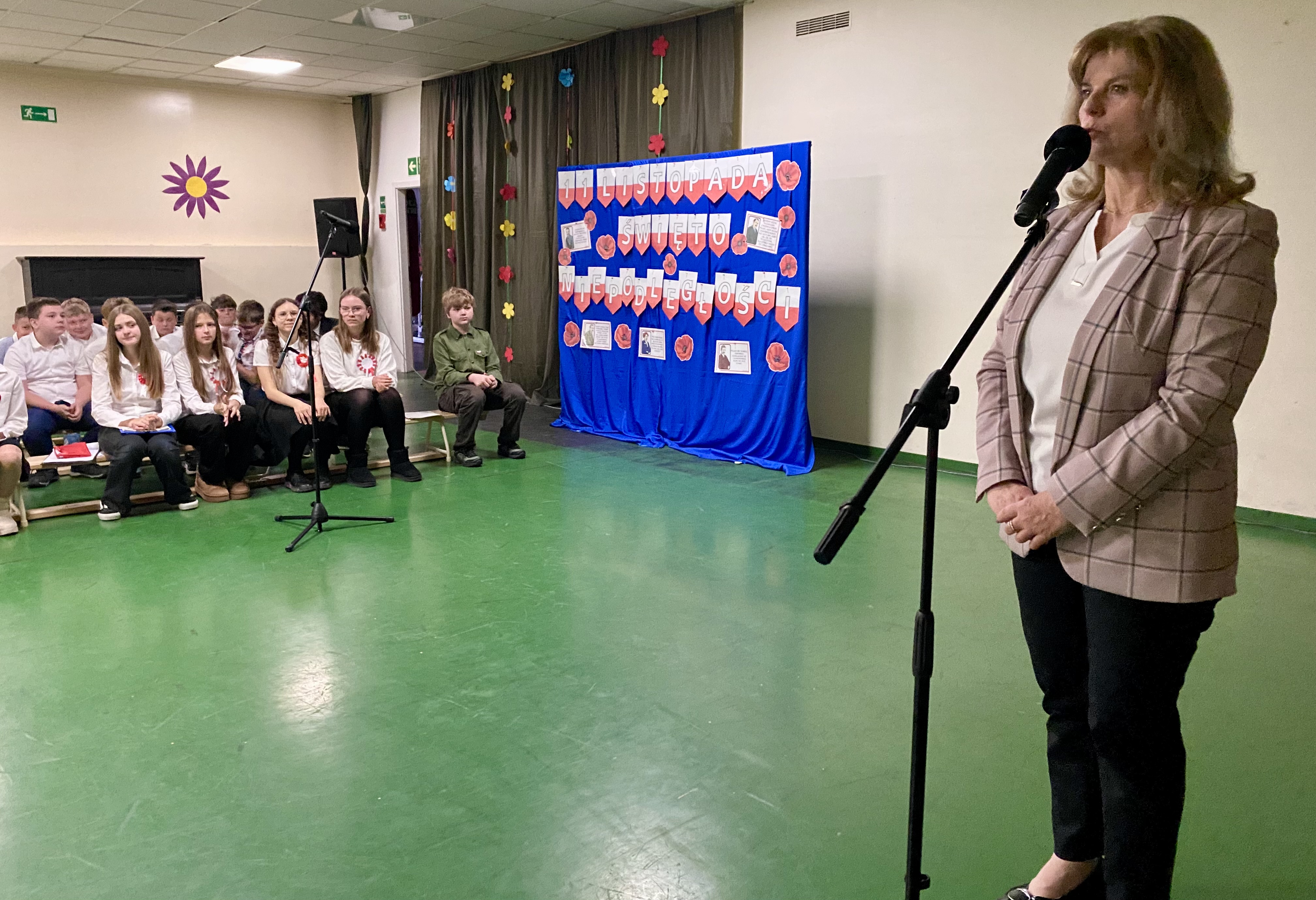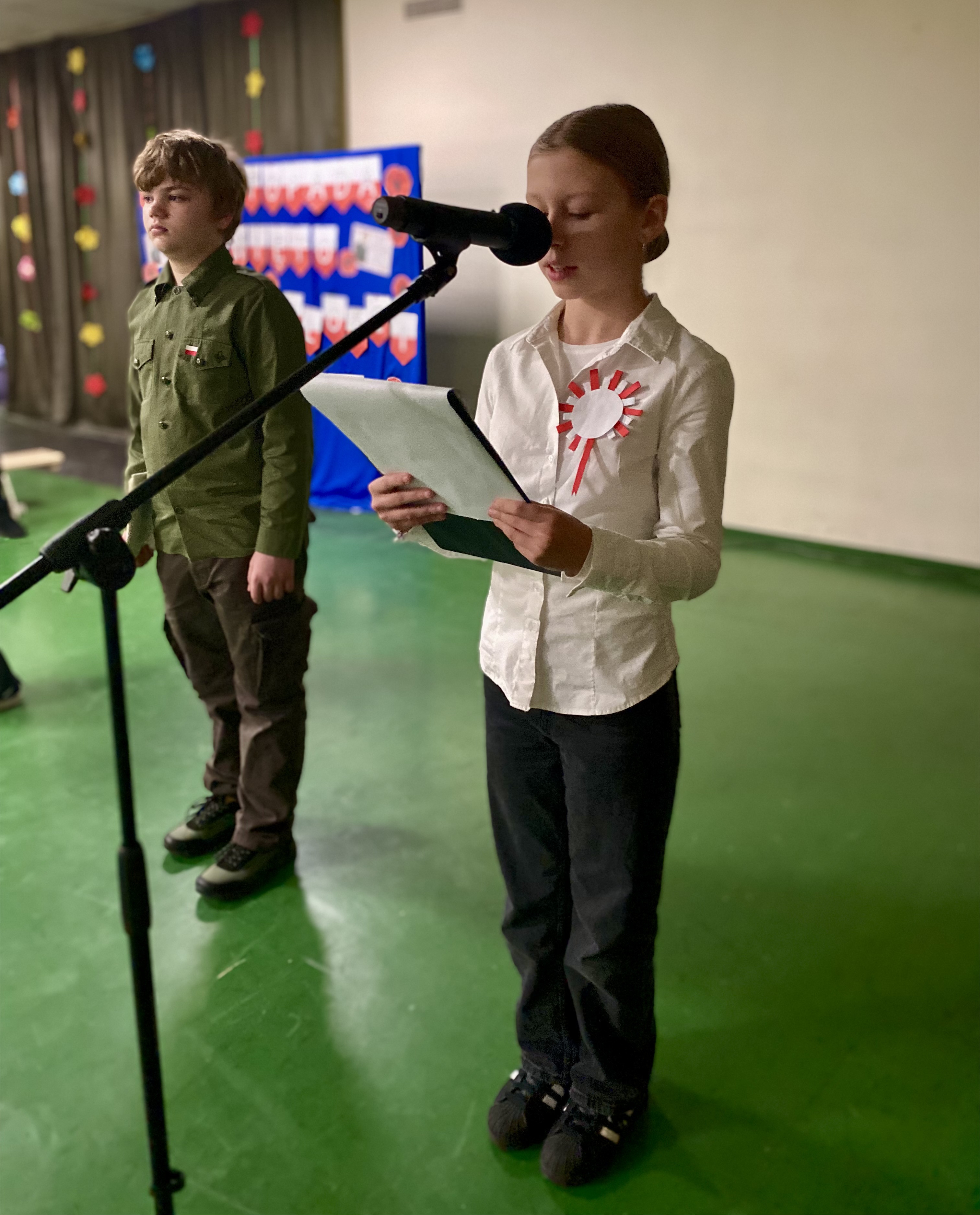 Soliści: Helena Bzik i Antonina Szulc, obok nich uczniowie z klasy 6a. Baczne oczy Wielkich Braci: Lidii Pietrzak oraz Dariusza Krysika, ręce czuwające na klawiaturach: Klaudia Marchewka i Łukasz Kalina. 107 lat od odzyskania przez Polskę niepodległości.