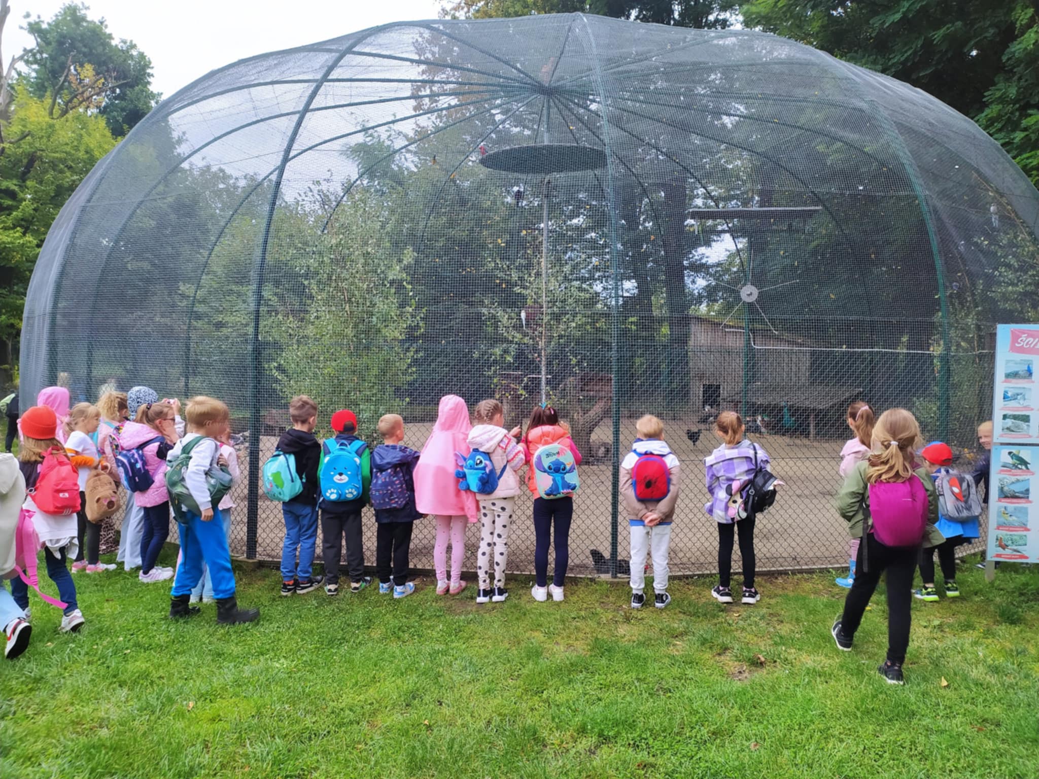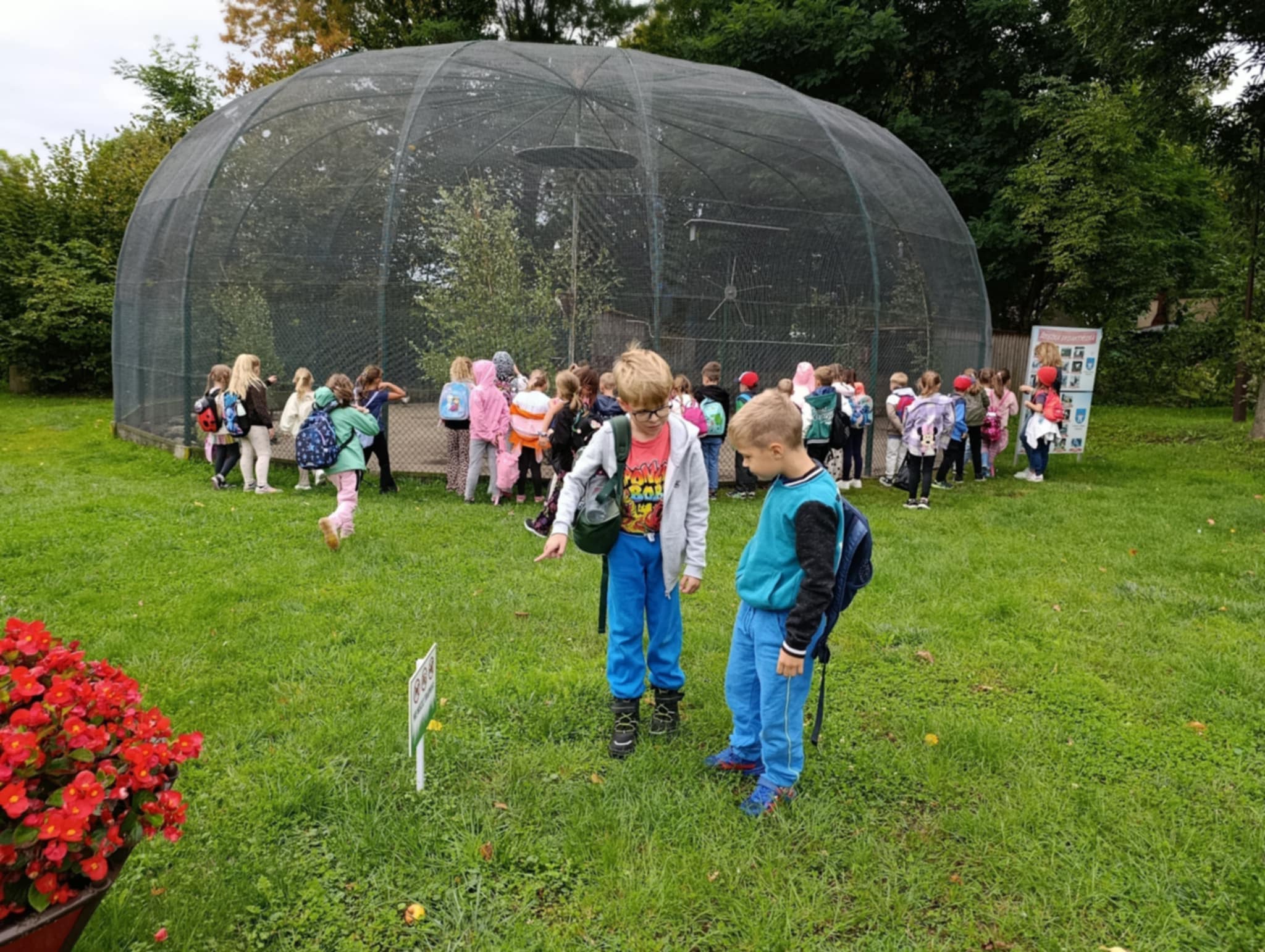 Kolejnym punktem programu była ścieżka dydaktyczna, gdzie uczniowie z ogromną ciekawością obserwowali różne gatunki ptaków – od kur ozdobnych i bażantów królewskich, po kolorowe i egzotyczne papugi. Duże zainteresowanie wzbudziły także kangury i alpaki. Uczniowie poznali również zegary słoneczne.