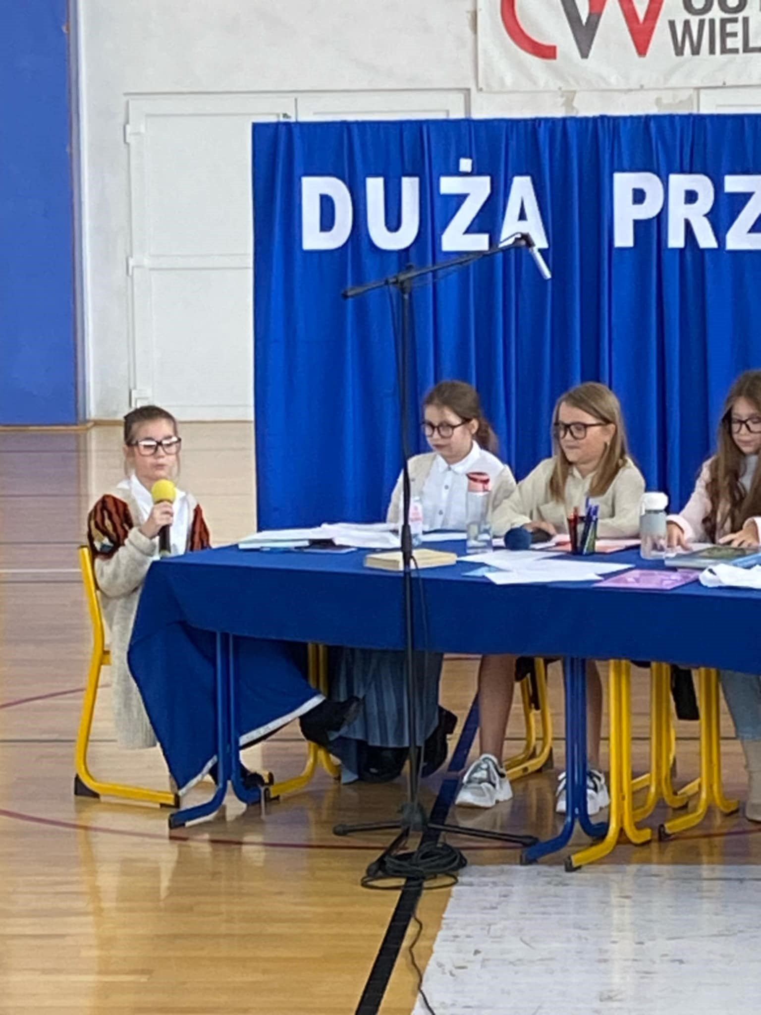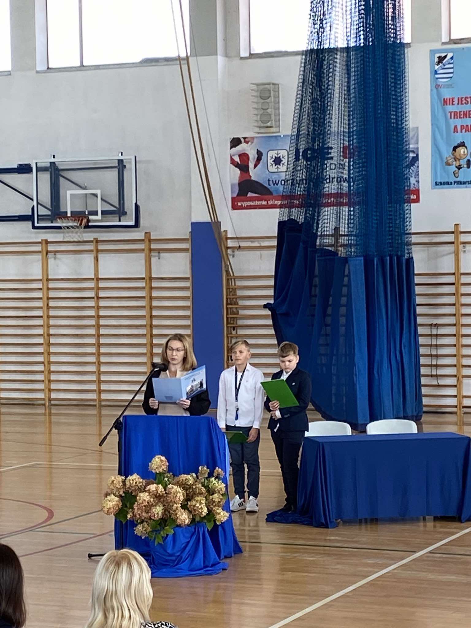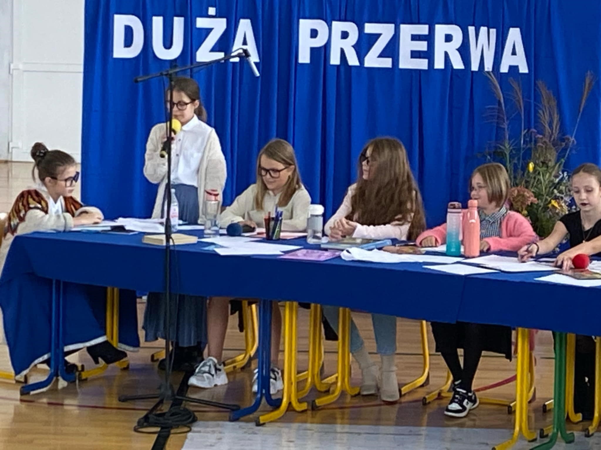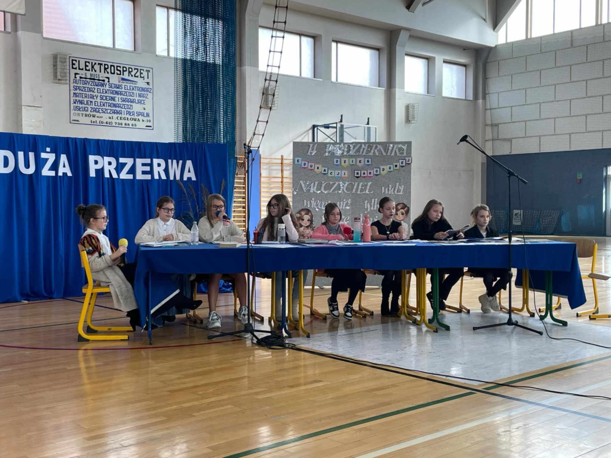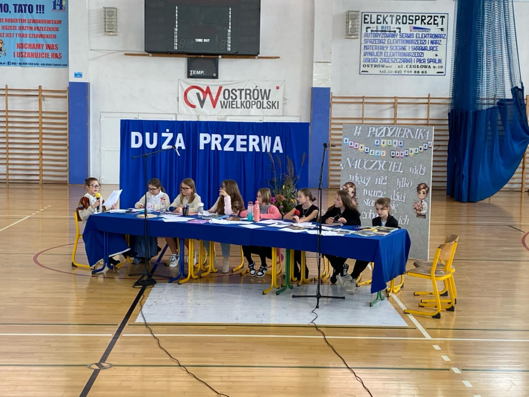 I właśnie z tej okazji cała społeczność szkolna spotkała się na uroczystej akademii. Przygotowali ją uczniowie klas 5A, 5B, 7B i 2A pod opieką pani Anny Pastuszak-Zalewski i Hanny Lesiewicz. Uczniowie przedstawili program artystyczny pod tytułem „Duża przerwa”, w zabawny sposób zaprezentowali problemy nauczycieli i dyskusje jakie się toczą w pokoju nauczycielskim na dużej przerwie.