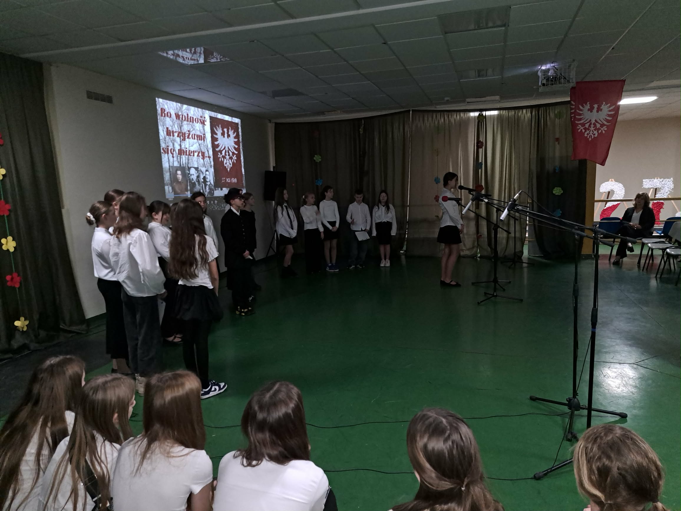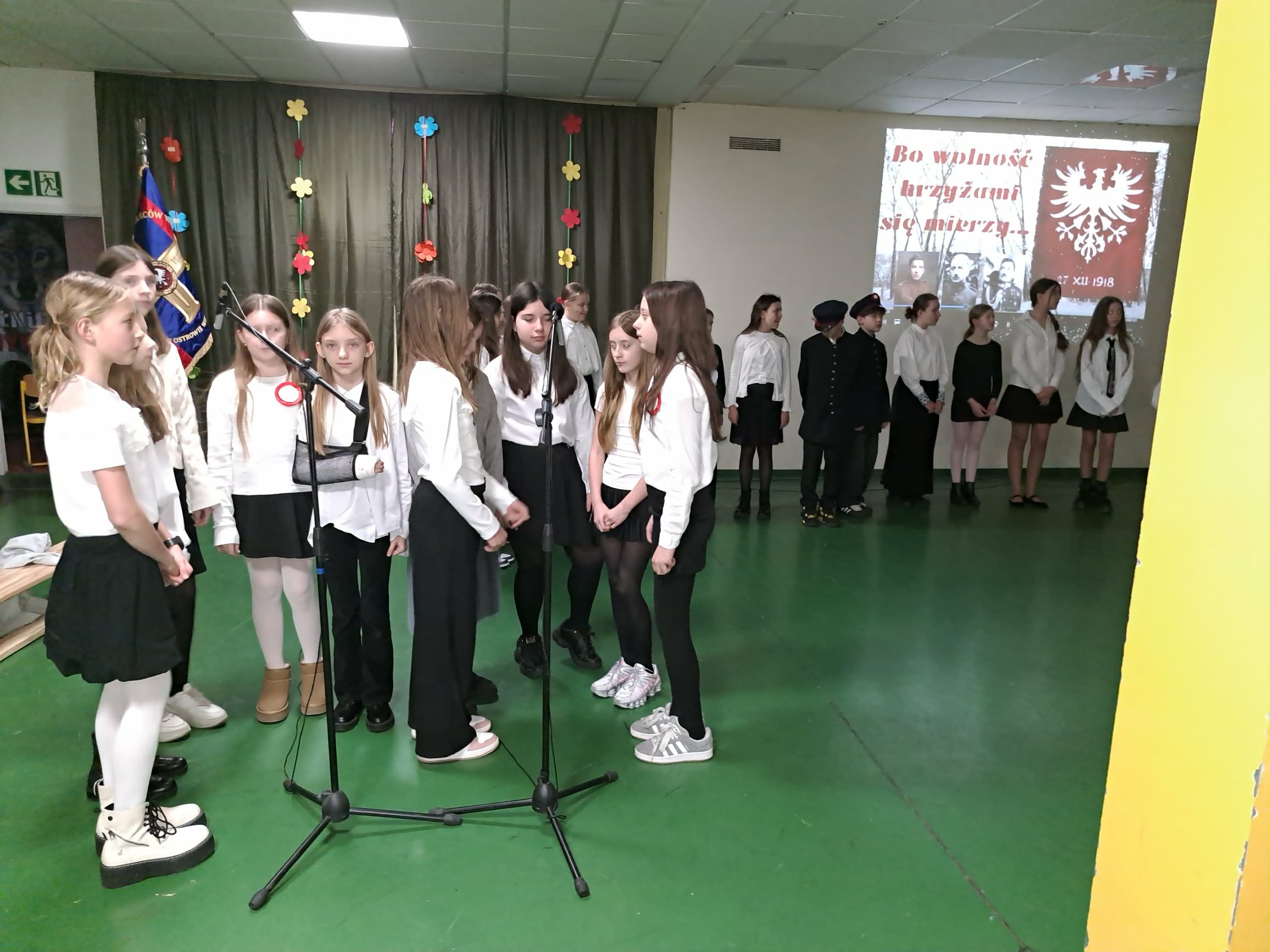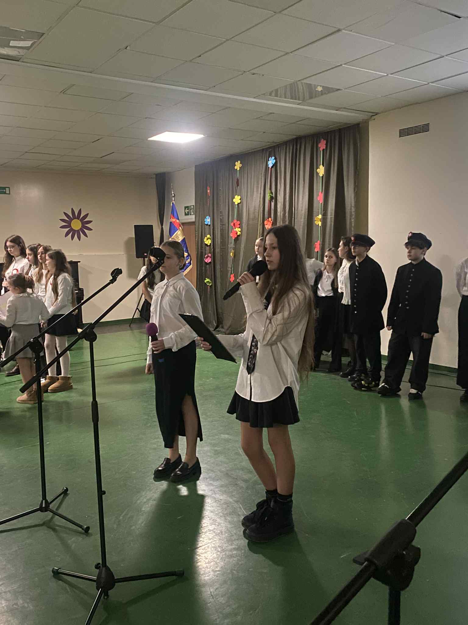 Oczywiście nie można zapomnieć o wspaniałym trio nauczycieli w sali kolumnowej: pp. Kamili Krawczyk (scenariusz), Hannie Lesiewicz (dyrygent chóru) oraz Klaudii Marchewce (nagłośnienie). Swojej pomocy nie odmówił duet obecnych duchem: pp. Karolina Treska oraz Leszek Moskwa.