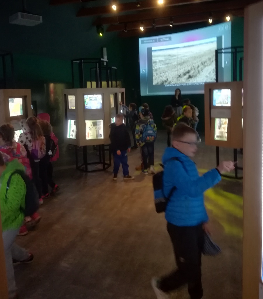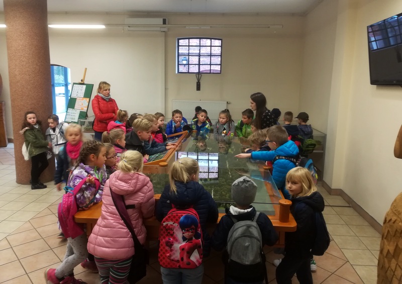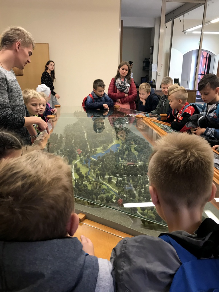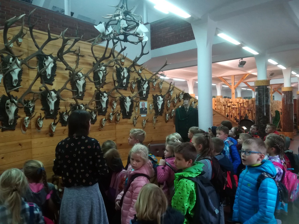 Następnie udaliśmy się do Muzeum Leśnictwa „Powozownia”. Uczniowie poznali gatunki drzew leśnych, warstwy lasu oraz pracę leśników na przestrzeni dziejów. Mogli zobaczyć maszyny, narzędzia i urządzenia pomiarowe, które nie są już stosowane w leśnictwie. Dzieci poznały także gatunki roślin i zwierząt, które zagrożone są wyginięciem w środowisku przyrodniczym Polski. Niezwykle ciekawym dla dzieci punktem zwiedzania okazała się multimedialna makieta edukacyjna, która służy do prezentacji walorów przyrodniczych oraz architektonicznych zabytkowej rezydencji.