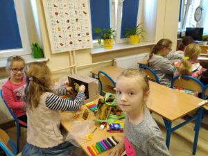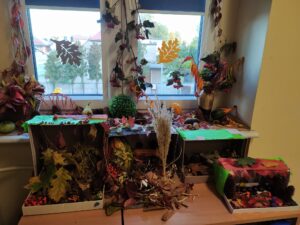 Natomiast w ramach realizacji projektu ,, Z EKOLOGIĄ NA TY. Moduł – Przyroda wokół nas”, uczniowie klasy 1b pracowali w grupach, by wykonać oryginalne prace – las w kartonie. Przedstawiając piękno jesiennego lasu dzieci pogłębiały wiedzę, a jednocześnie świetnie się przy tym bawiły. Prace można podziwiać w fotorelacji poniżej oraz na wystawie klasowej.