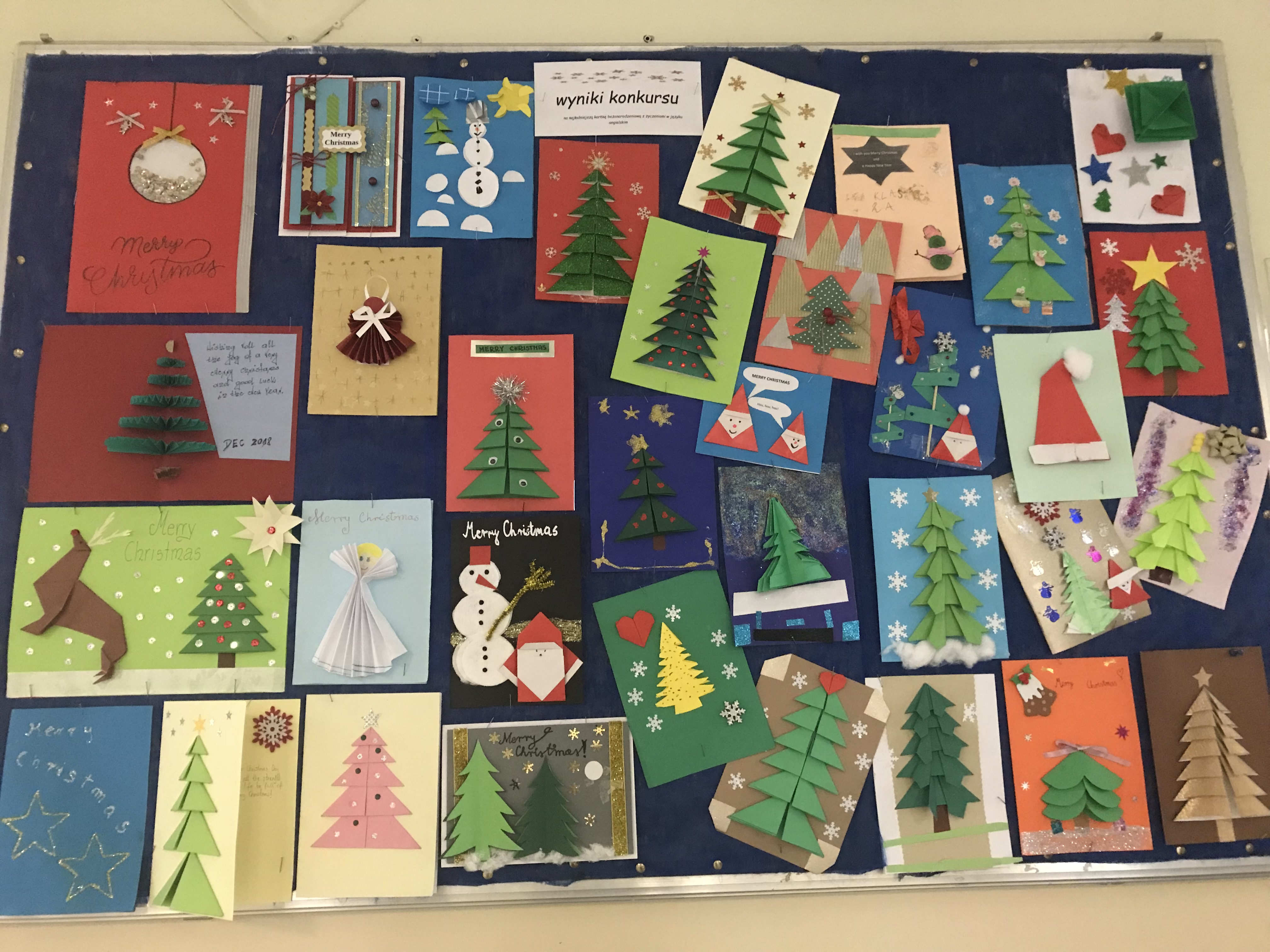Bardzo dziękujemy za udział w konkursie na najładniejszą kartkę bożonarodzeniową z elementami origami i życzeniami w języku angielskim. Komisja oceniająca prace zrezygnowała z kryterium formatu A4. Klasy 1 i 2a wykonywały kartki na zajęciach języka angielskiego, więc ocenione zostały bardziej pod kątem nakładu pracy i oryginalnego pomysłu niż estetyki. Oczekiwano, iż prace będą nietuzinkowe i odbiegające od utartych schematów. Oto wyniki: