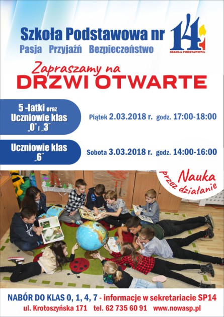 Informujemy, że z dniem 1 lutego 2018 r. otwarta zostanie rekrutacja do klasy pierwszej Szkoły Podstawowej nr 14 w Ostrowie Wielkopolskim. Rekrutacja zasadnicza potrwa do dnia 30 maja 2018 r. Zgłoszenia można dokonać bezpośrednio w szkole, lub za pomocą elektronicznego systemu NABO poprzez wypełnienie dokumentu, który należy wydrukować, podpisać i złożyć w szkole.