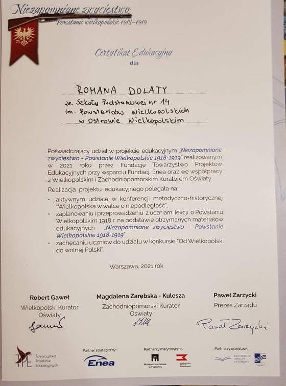Zauważony został też aktywna realizacja projektu „Niezapomniane zwycięstwo – Powstanie Wielkopolskie 1918-1919”, w tym lekcje historyczne z udziałem członków Koła edukacji patriotycznej „Pamięć wciąż żywa”.