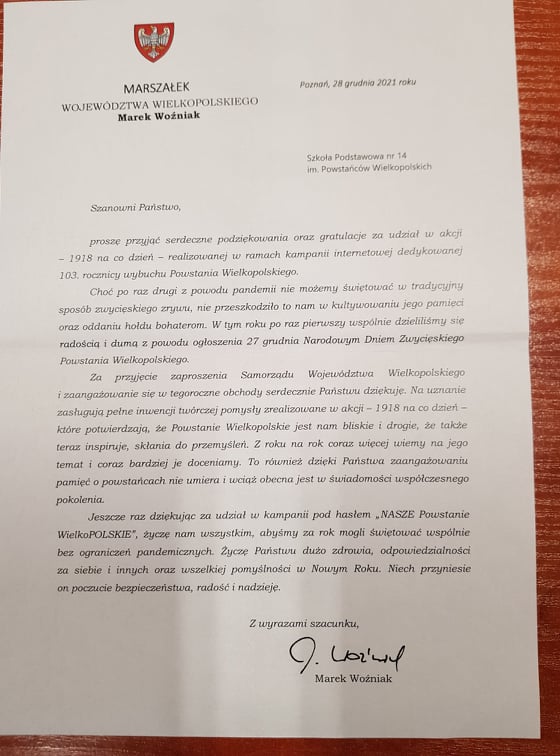W ostatnich dniach dotarły do nas podziękowania i wyróżnienia za udział w projektach upamiętniających zwycięskie Powstanie Wielkopolskie. Marszałek Województwa Wielkopolskiego pogratulował szkole za włączenie się do akcji „1918 na co dzień”, a uczniowie, którzy stworzyli kalendarz nawiązujący do wydarzeń z lat 1918-1919, nagrody książkowe.